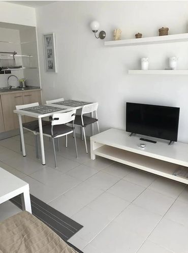 The apartment consists of a double bedroom with twin beds and built in wardrobes, a bathroom with walk in shower, washbasin and W.C. The open plan living area has a kitchen, dining table and chairs along with a sofa.
