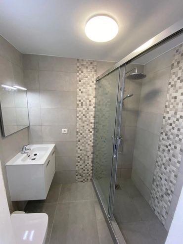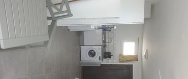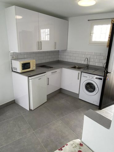 The apartment includes a kitchenette, a bright living area, and a bathroom with shower.